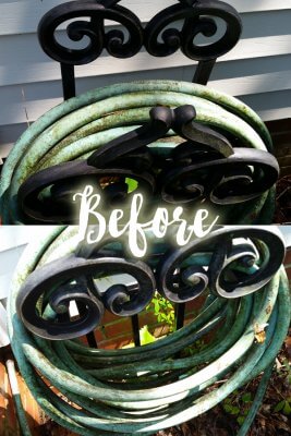 This works great on poles that hold up the porch, water hoses, sidewalks, shutters, and anything else where that icky green algae from the moisture decides to take up residence. Since I forgot to take pictures before I started washing the house, I did manage to get a before picture of the water hose. It's easy to forget those, since they are usually wound up on something, and who wants to even mess with cleaning that?